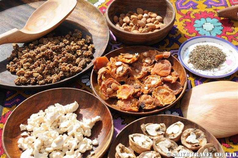 Dried apricots form a major part of the winter diet. Known locally by various names, they are sun-dried without chemicals and stored for months. During winter, dried apricots are soaked in water and eaten daily.